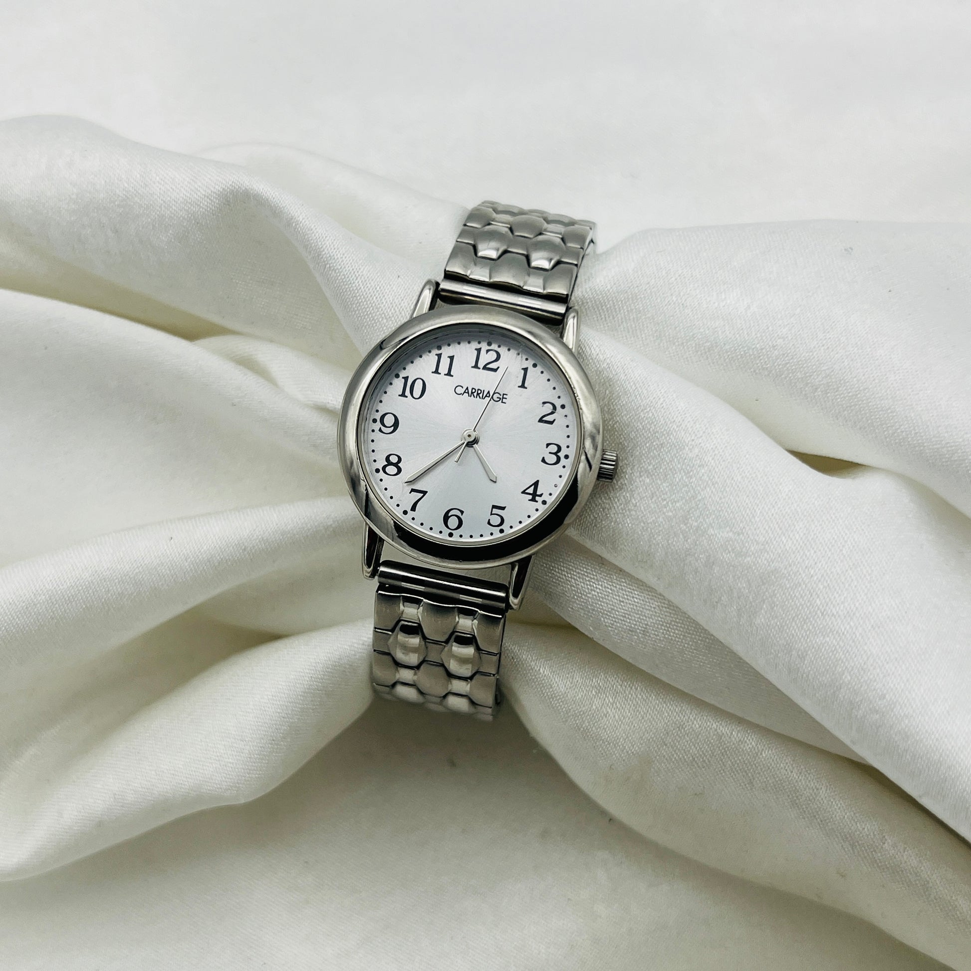 Tick-tock, style unlock! This sleek silver-toned Carriage watch brings timeless elegance to your wrist with its polished finish and refined design. Whether you're dashing to brunch or conquering your to-do list, this versatile timepiece keeps you punctual in pure sophistication. The classic silver tone pairs effortlessly with any outfit, making it the go-to accessory for those who appreciate understated glamour. Time to make every moment count—in style.