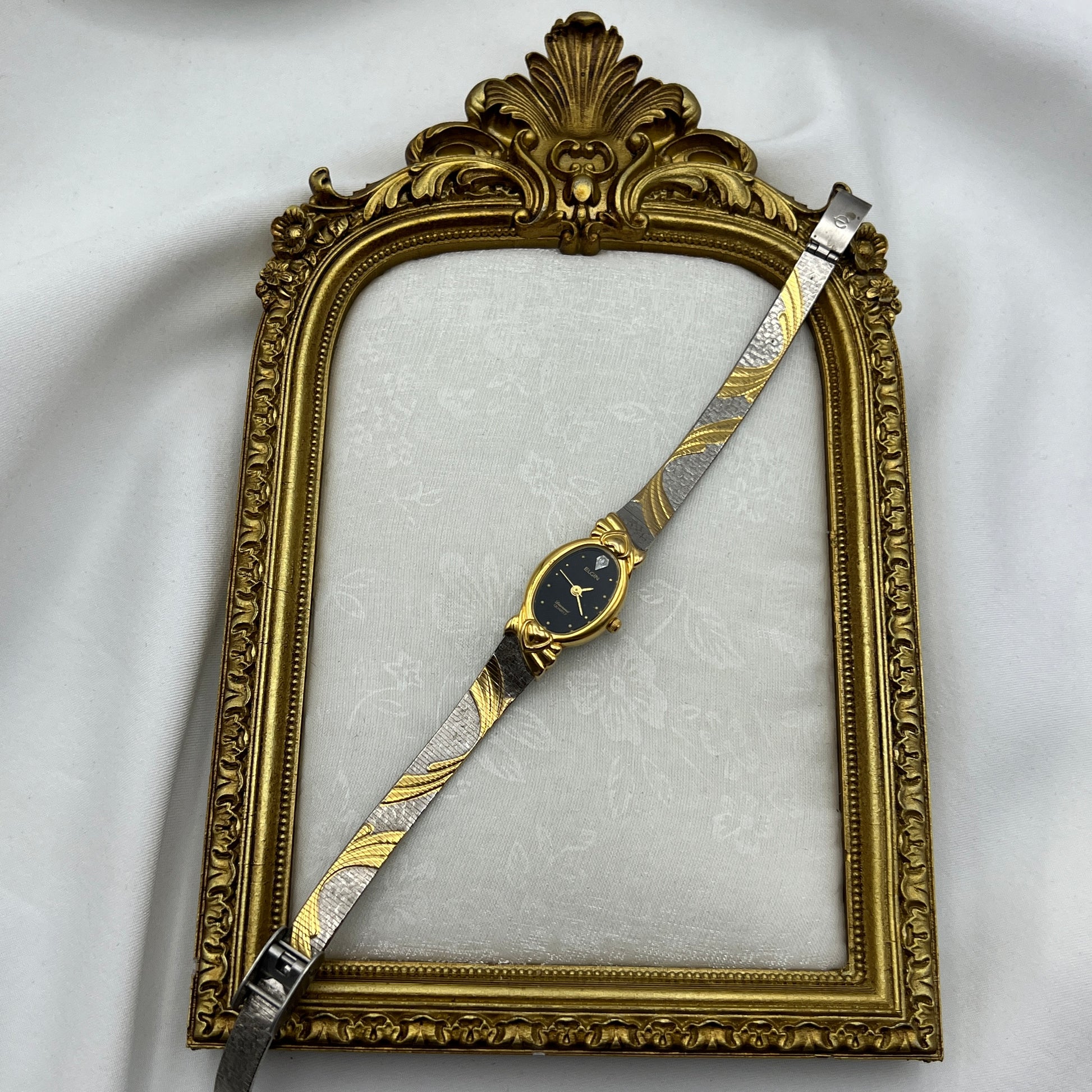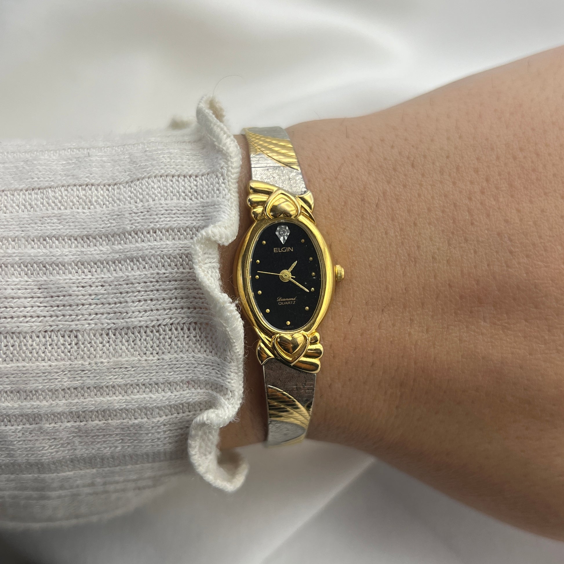 Elgin Two-Tone Hearts Bezel Watch A charming vintage timepiece featuring a distinctive two-tone hearts bezel design. This pre-owned Elgin watch showcases quartz movement for reliable timekeeping. The adjustable band ensures a comfortable fit for most wrists. Please note this watch is untested and sold as-is. A delightful addition to any vintage watch collection or a unique gift for the Elgin enthusiast.