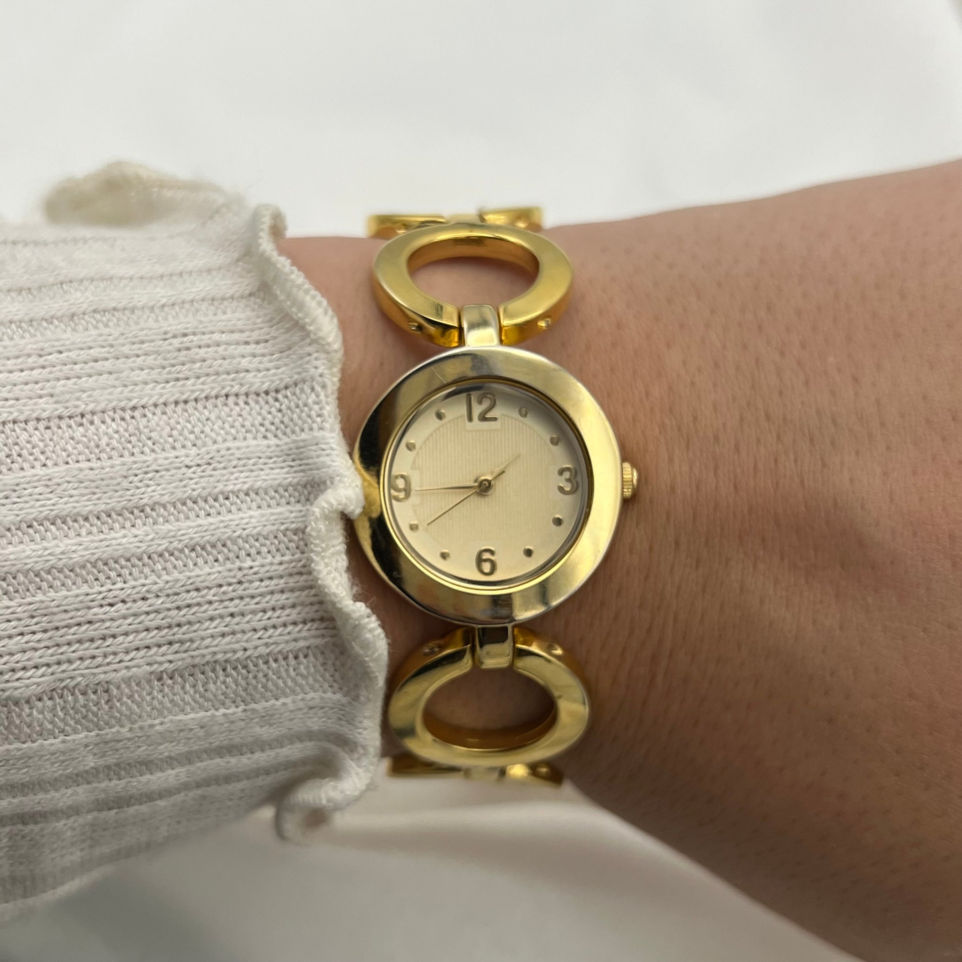 Timeless elegance meets modern flair with this stunning gold-toned circle watch. The classic round face catches the light beautifully, while the warm metallic finish adds a touch of sophistication to any outfit. Whether you're dressing up for a special occasion or elevating your everyday style, this versatile timepiece keeps you punctual in pure gold-toned glamour. A must-have accessory that works as hard as you do.
