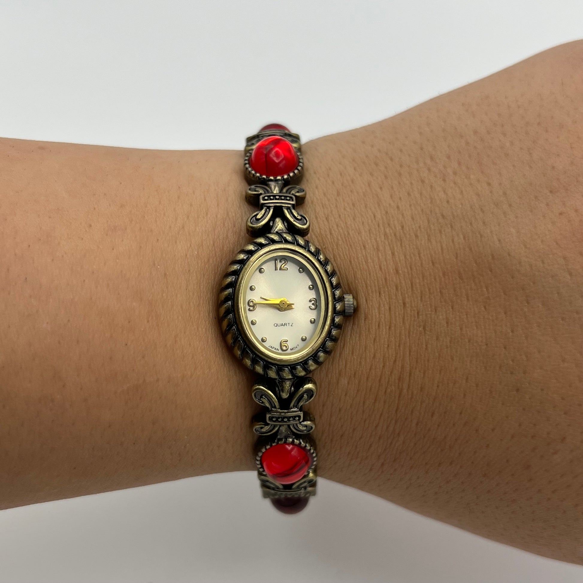 Experience the ultimate in style and elegance with our Red Stone Watch. The vibrant red stone feature adds a striking pop of color to your wrist, making a statement with every glance. Elevate your look and make a bold impression with this unique timepiece.